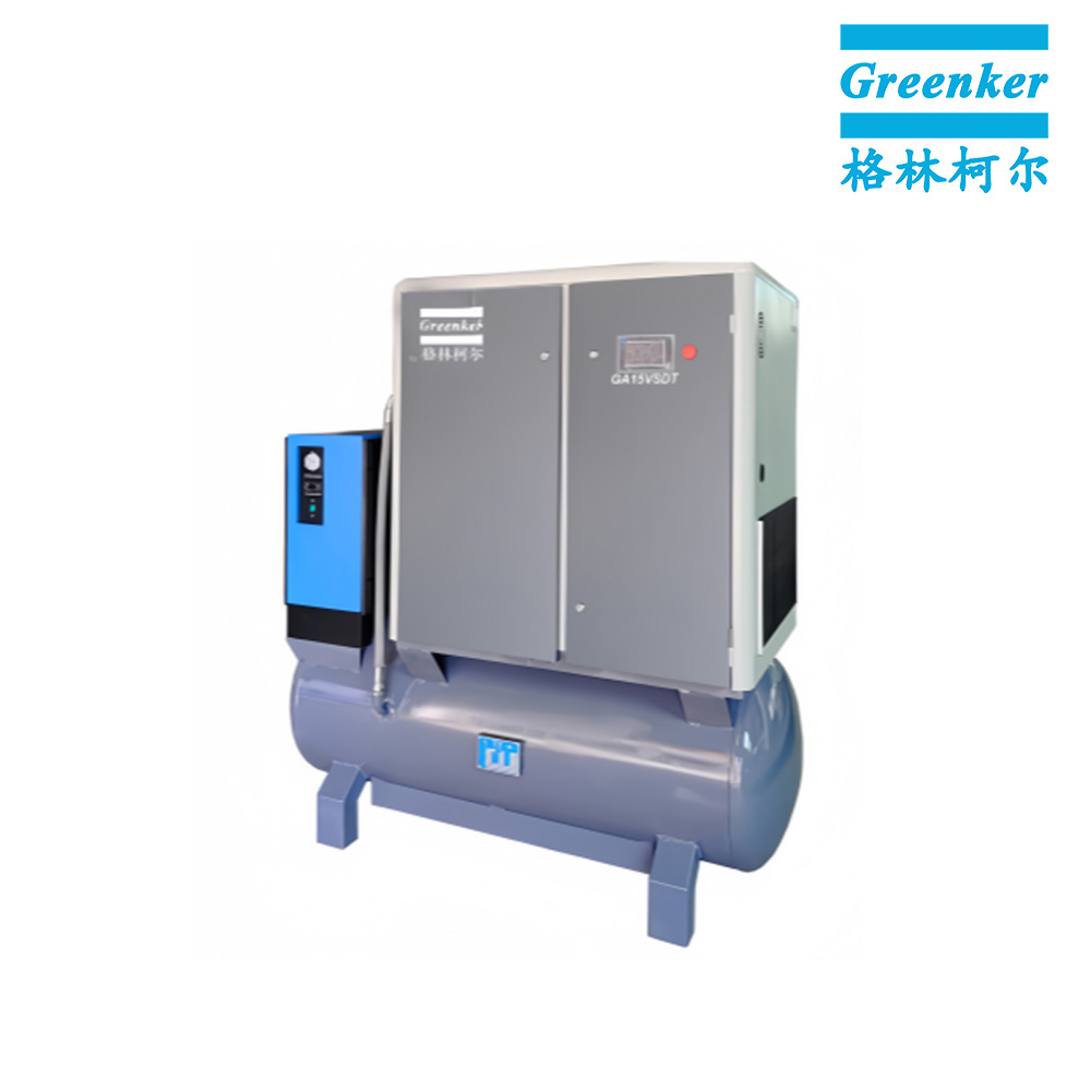 ضاغط الهواء الحلزوني المتغير السرعة Greenker GA15VSDT هو ضاغط هواء مدمج وعالي الأداء يدمج الضاغط وخزان الهواء والمجفف المبرد والمرشحات الدقيقة في وحدة واحدة.